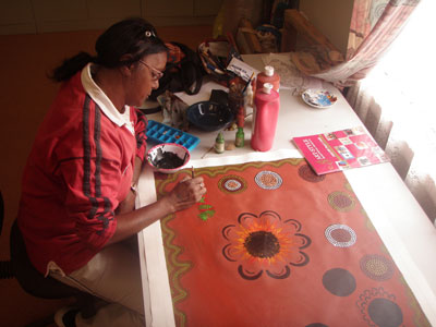| The development of Scotdesco Art Is supported by talented Art mentors Janine Gray and Glenette Miller, Janine and Glenette encourage younger community members and visiting school groups to learn the skills of painting. Visitors to the community are welcome to watch artists paint and talk with them about the artwork.